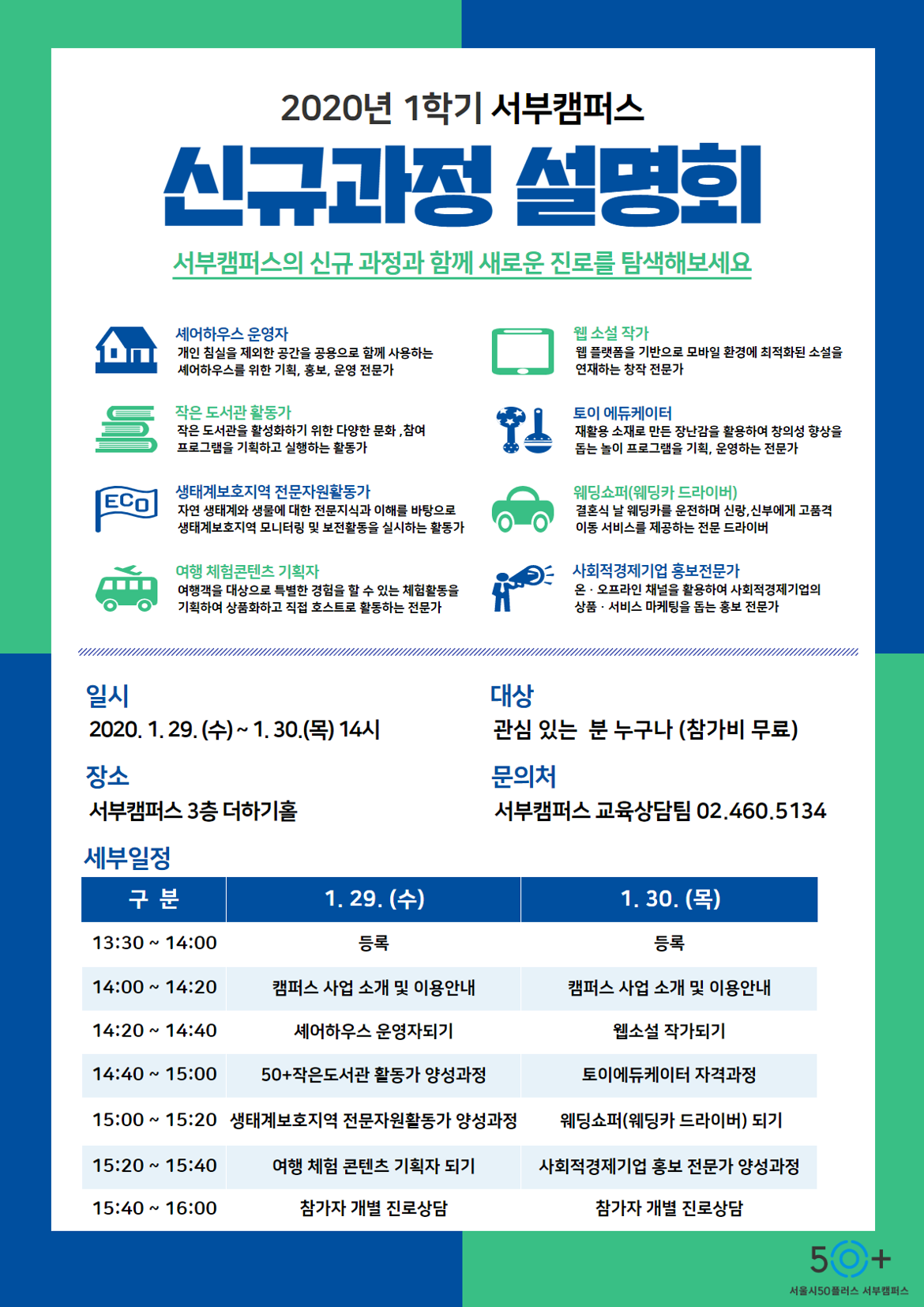 (2 회차) 2020.01.31(14:00 ~ 16:00) 더하기홀 서부캠퍼스 강사진 셰어하우스 운영자되기, 50+작은도서관 활동가 양성과정, 생태계보호지역 전문활동가 양성과정, 여행 체험콘텐츠 기획자되기 없음