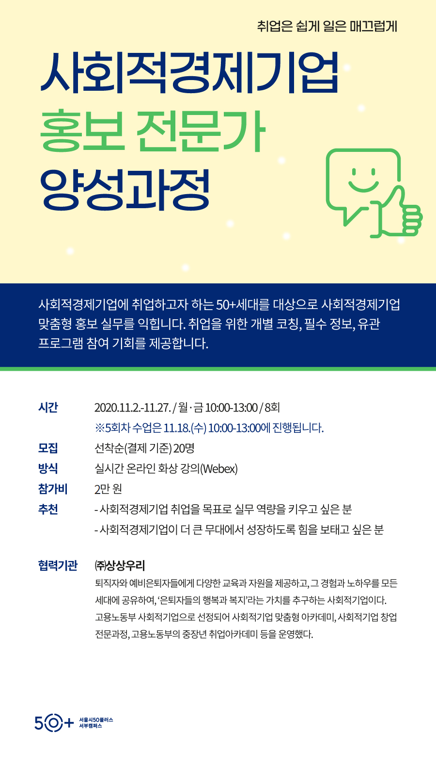 • - 50+세대의 인생 2막 설계와 전직, 취업, 창업을 위한 교육, 컨설팅을 제공합니다.