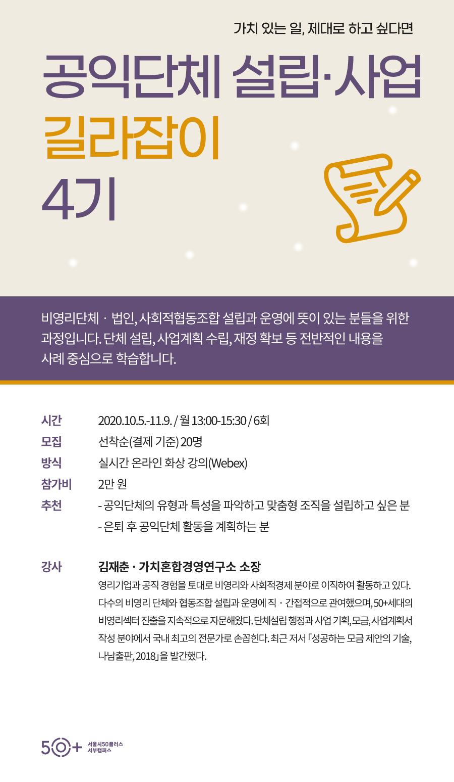 (4 회차) 2020.10.26(13:00 ~ 15:00) Webex 김재춘 비영리단체 운영 및 활동의 이해와 개요 없음