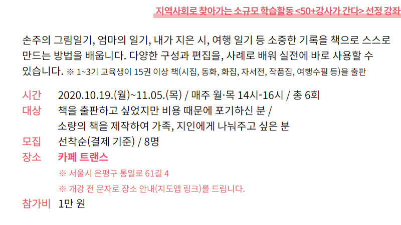 (1 회차) 2020.10.19(14:00 ~ 16:00) 카페 트랜스 김정수 50+의 출판사례 소개 없음