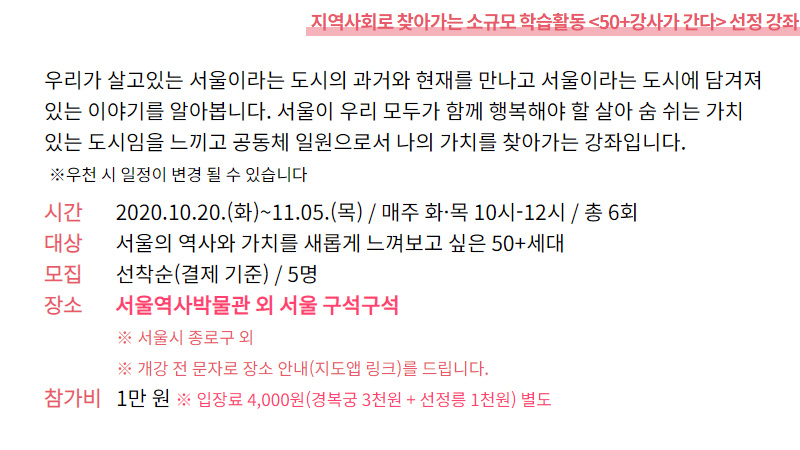 (4 회차) 2020.10.29(10:00 ~ 12:00) 현장학습 허경심 한양도성 - 마음 여행 “in 서울을 아시나요?” 없음