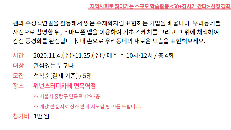 (4 회차) 2020.11.25(10:00 ~ 12:00) 위넌스터디카페 면목역점 김윤숙 감성 담은 색으로 완성하기 연필(HB), 지우개, 볼펜, 물통용 작은 컵