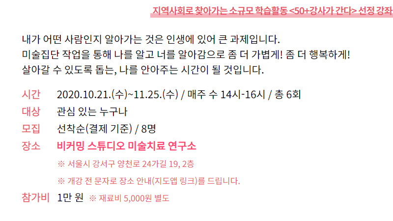 (5 회차) 2020.11.18(14:00 ~ 16:00) 비커밍 스튜디오 미술치료 연구소 이명순 안전한 공간(기쁨과 쉼) 없음