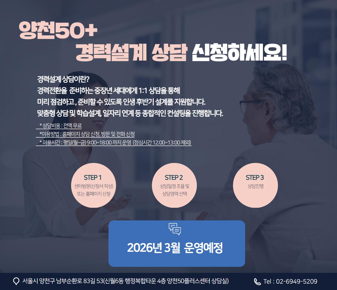 양천50플러스센터 서울특별시 양천구 남부순환로83길 53, (신월6동 행정복합타운 4층) 사업자등록번호 : 514-82-92140