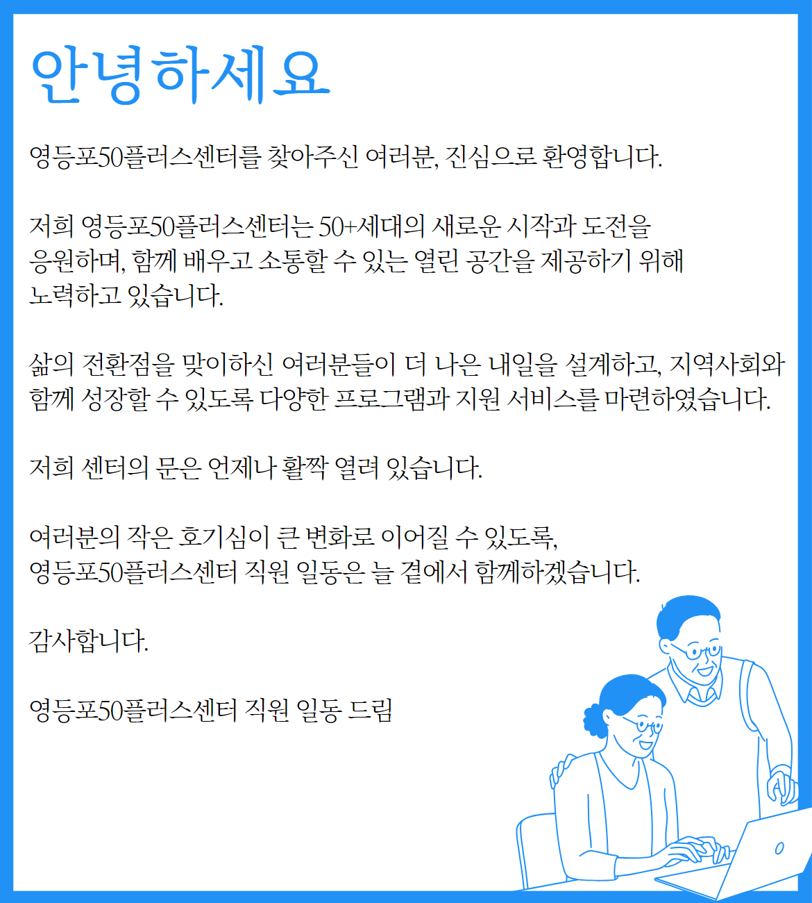 영등포50플러스센터 (07342) 서울특별시 영등포구 여의대방로 372(여의도동 56-1) 여의도복지관 3층 사업자등록번호 : (고유)402-82-86291 대표자 : 박철상
